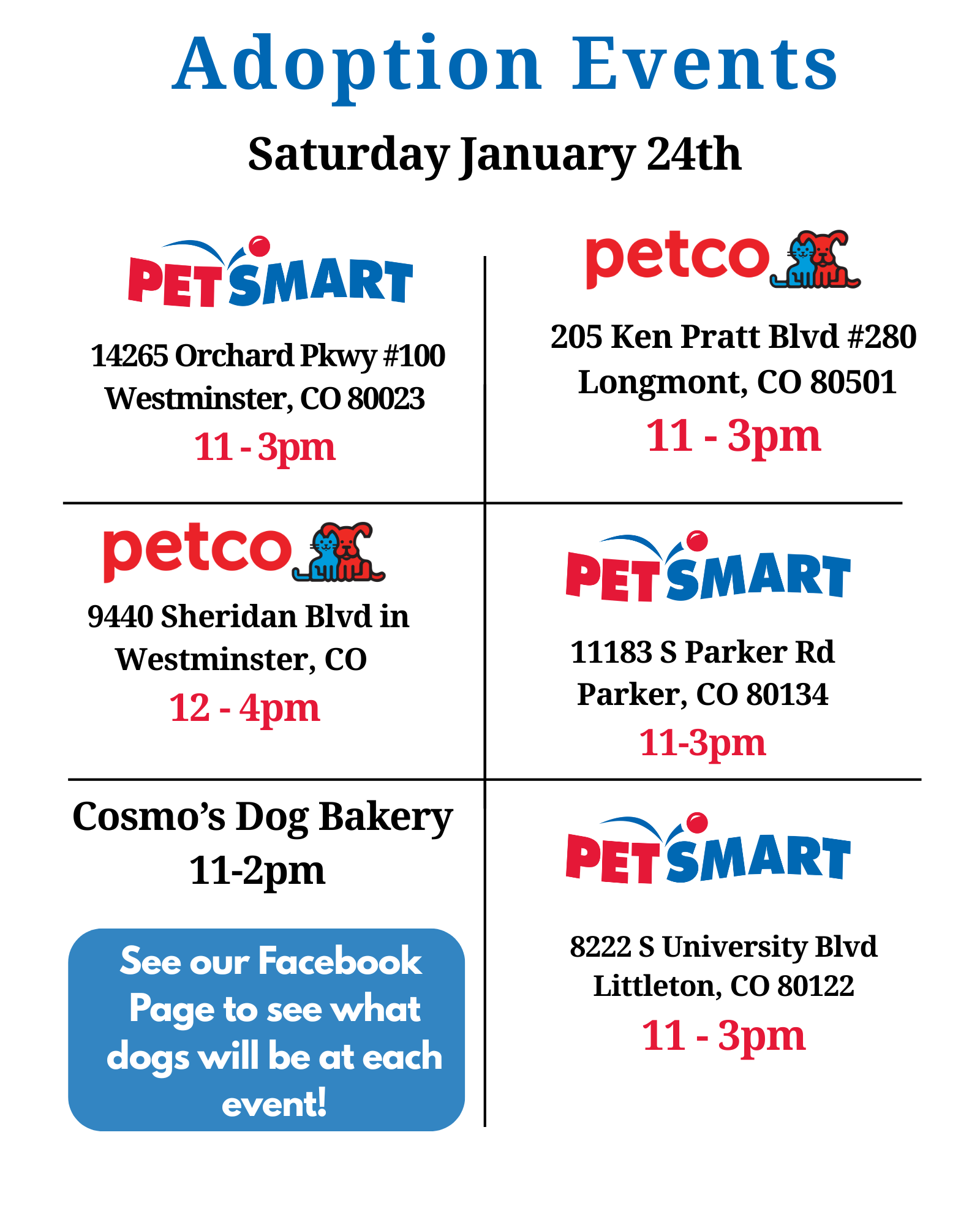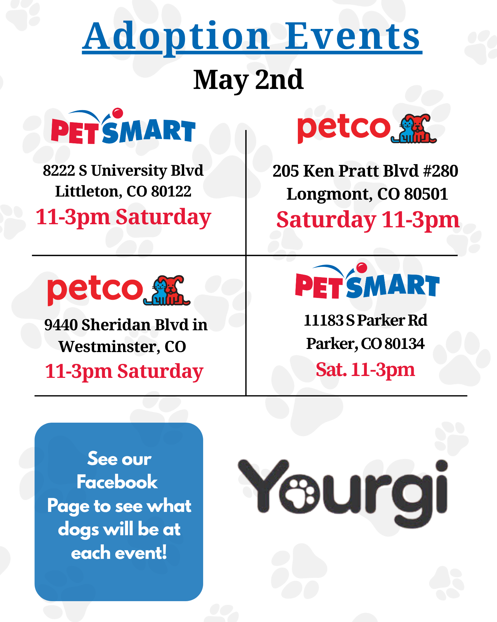 Come to our adoption events this week to meet some of our puppies and dogs available for adoption! If you are looking for your next family member, we recommend you pre-apply before events to speed up the adoption process in person. All lists below are subject to change. Check out our Facebook page to see what dogs will be at each event, they are posted at the end of the week.